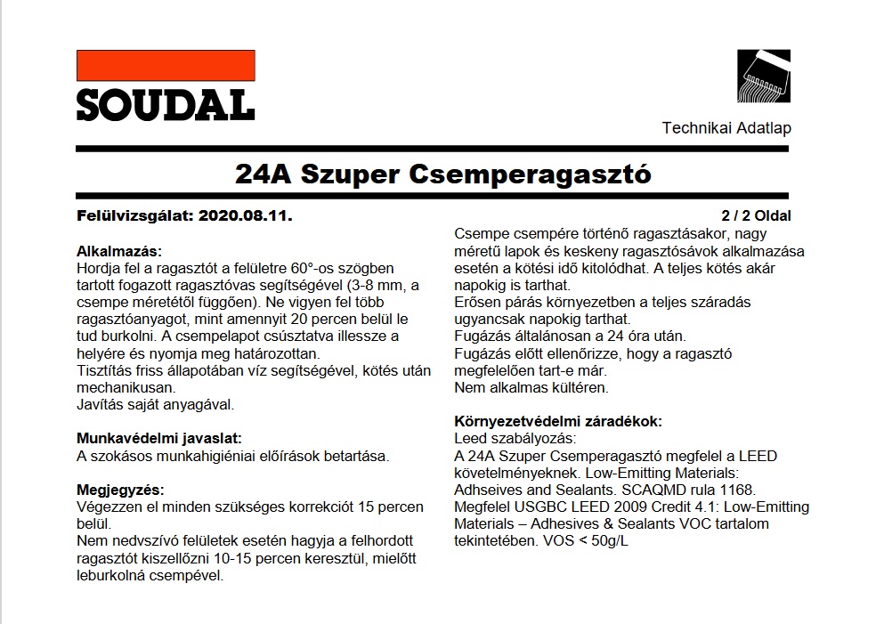 Cikkszám: Soudal 24A csemperagasztó 1 kg