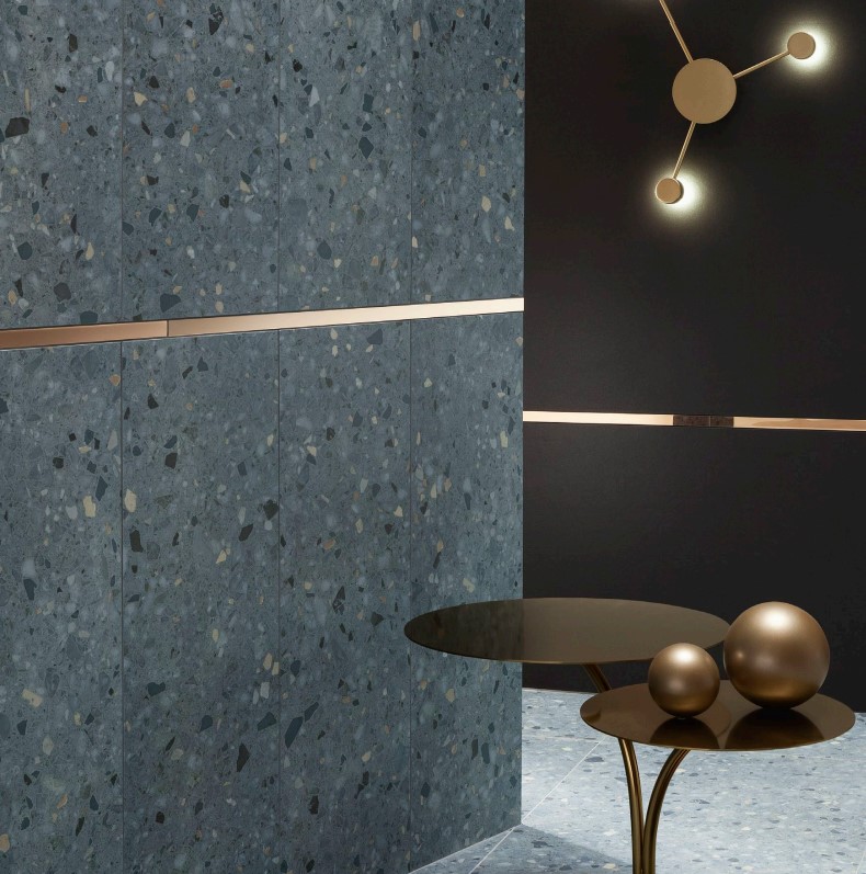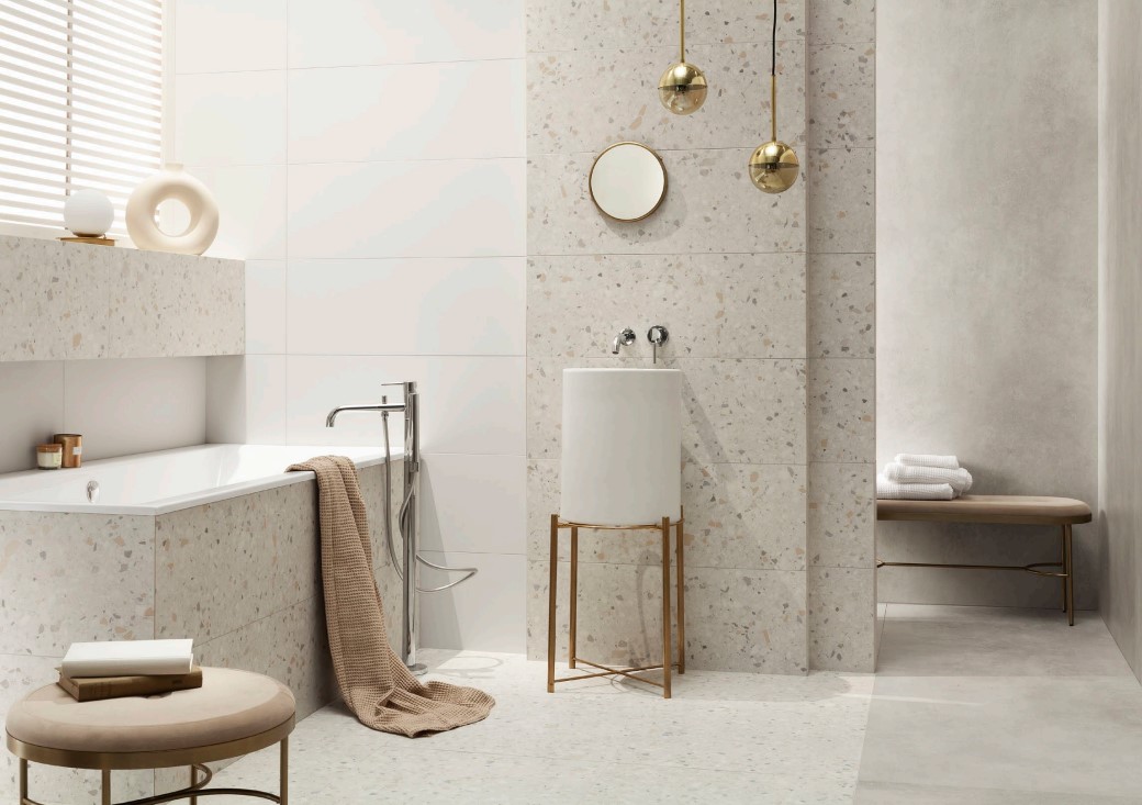 - Stílus: Fényes Terazzo minták matt padlóval és alaplappal. Az egyszűrség lenyűgöző erejű kombinációja