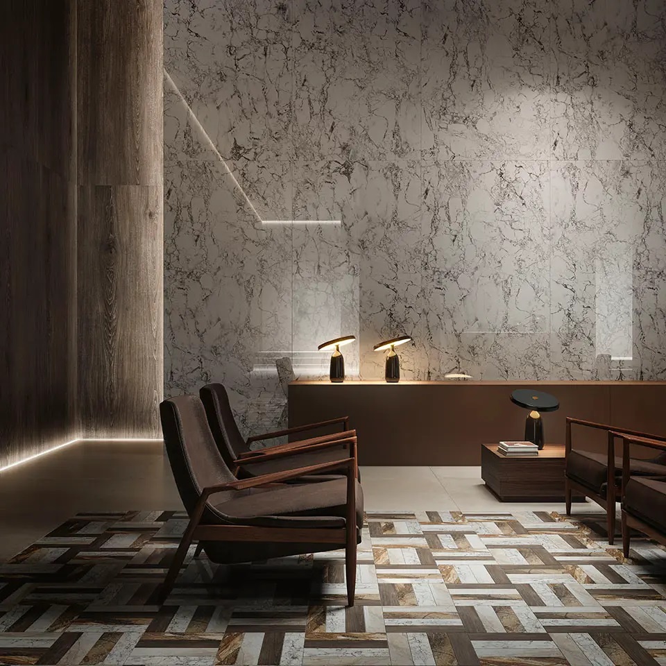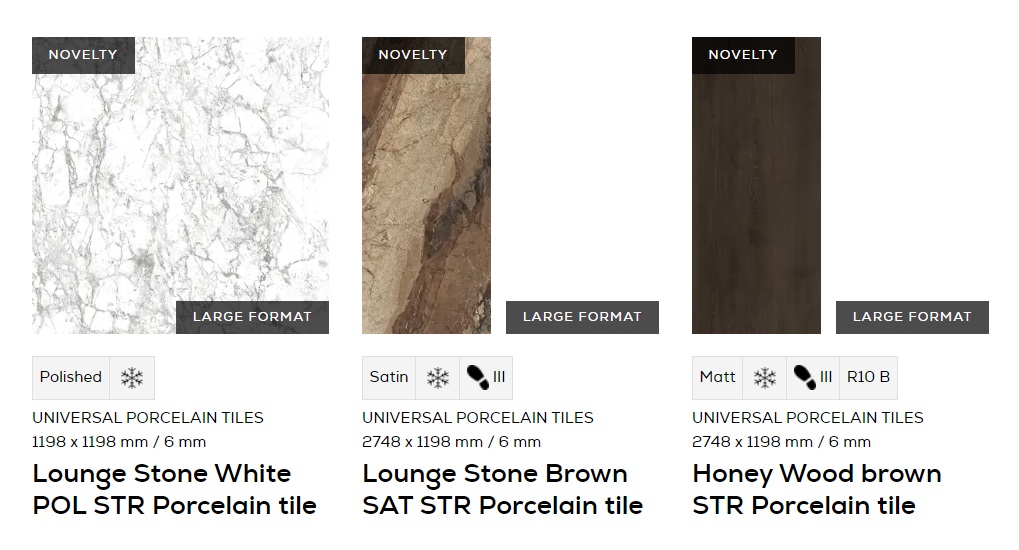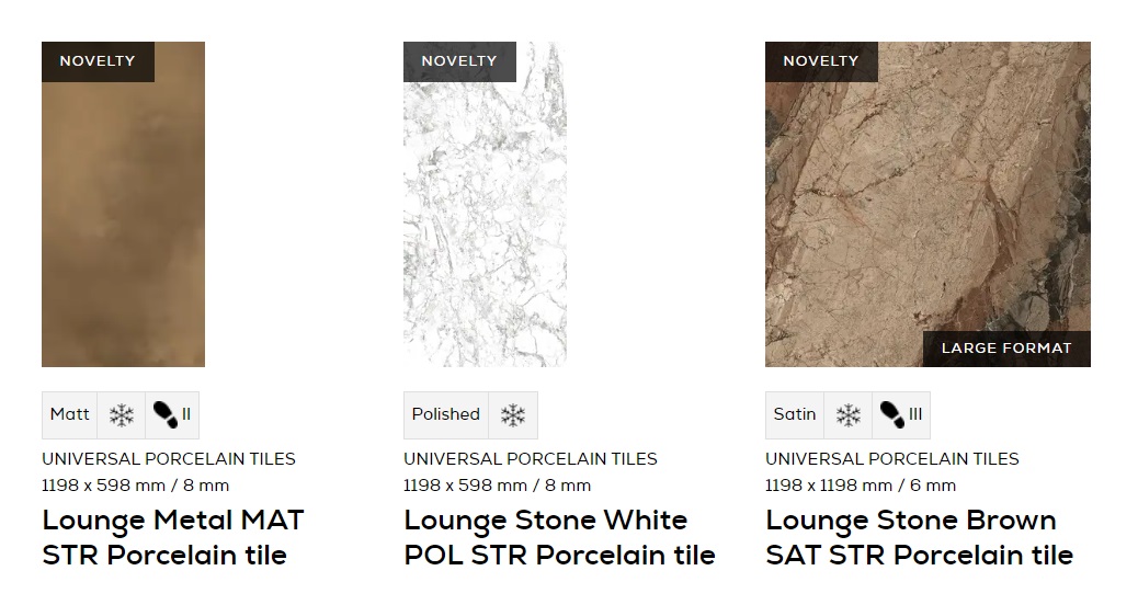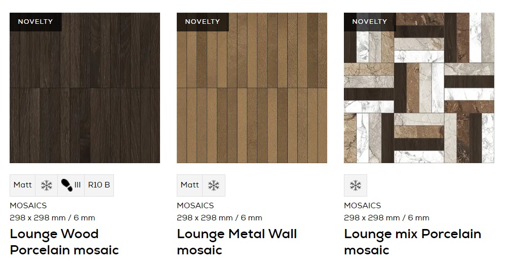 Tubadzin Lounge 11 elemes, nagyméretű csempe és padlólap termékcsalád, többféle mérettel, többféle felülettel, 3D technológiával