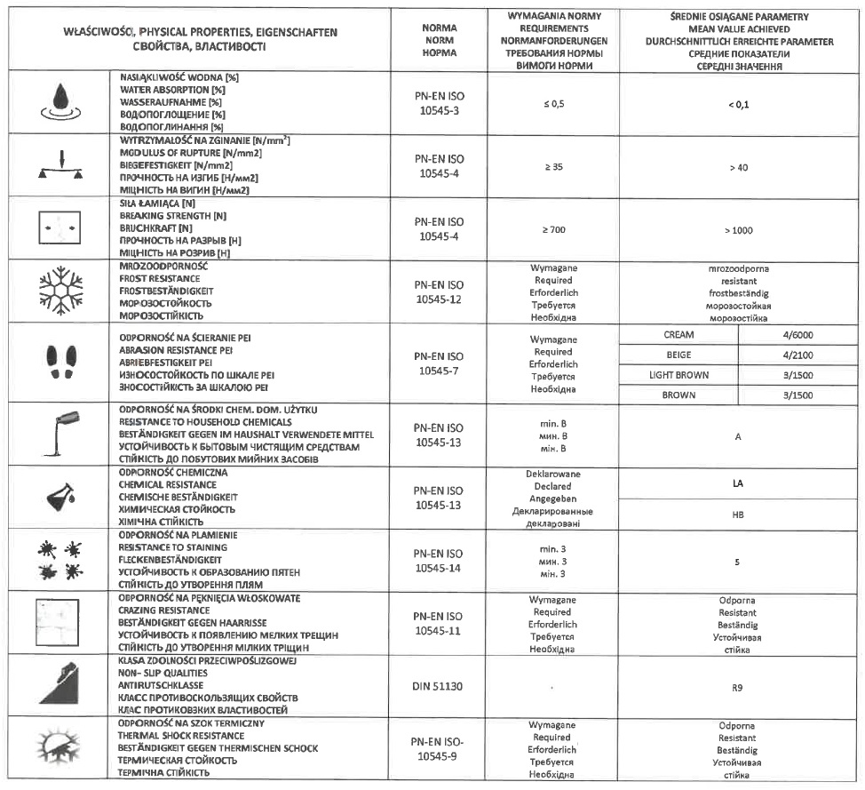 - Kopásállóság: Cream és Beige szín: PEI 4 / Light Brown és Brown PEI 3
